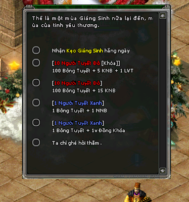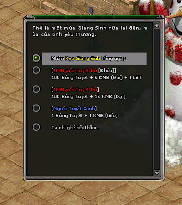 - Các huynh đệ tham gia hoạt động tới NPC Người Tuyết Vui Vẻ đối thoại và chọn : Nhận Kẹo Giáng Sinh hằng ngày