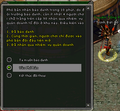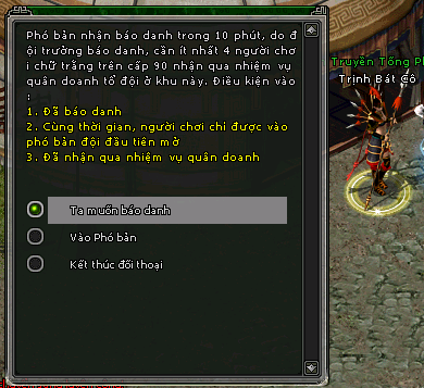 - Báo danh thành công kêu gọi thành viên tổ đội đến chỗ npc để tiến hành vào phó bản.