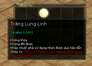 - Cần 10 Thần Kỳ Thạch + 15 Kim Nguyên Bảo để ghép được 10 Trăng Lung Linh ( Không Khóa )